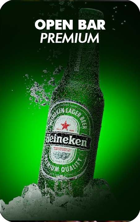 Cerveja Heineken, refrigerantes, sucos, água mineral, água de coco, whisky 8 anos, vodka, gin, energético, Campari e drinks variados.
