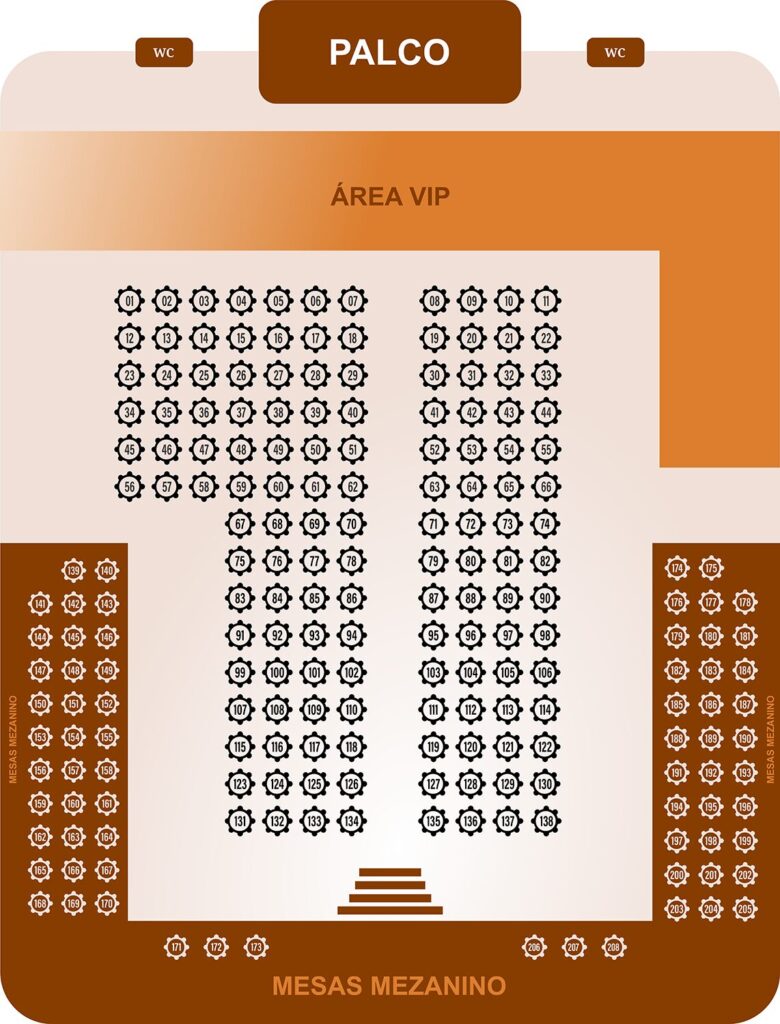 Mesas premium - Cada mesa garante exclusividade e conforto para o seu grupo, com atendimento personalizado, buffet premium e vista privilegiada do palco.